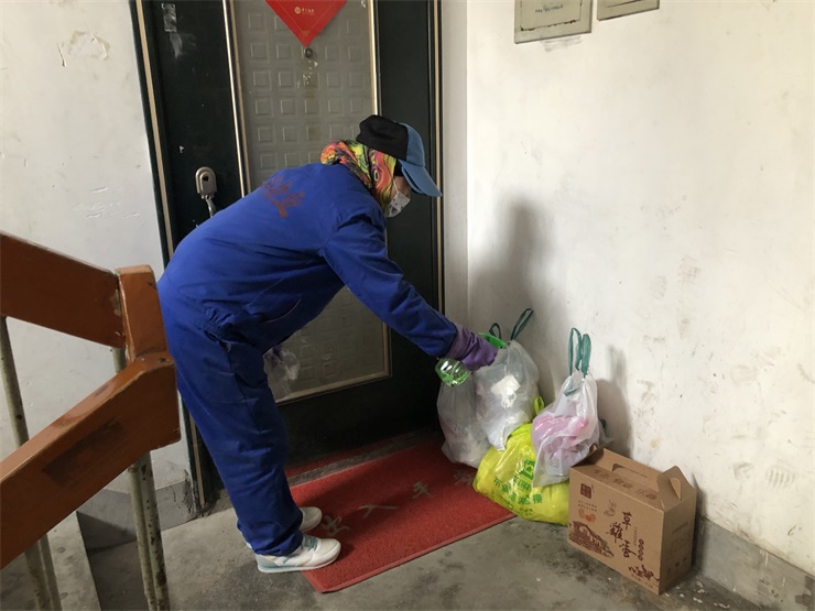 上午10点,苍梧小区保洁吉春霞来到业主家门口,定时为业主清理生活垃圾,将门外堆放的垃圾清理消毒后,再送下楼放到小区指定垃圾堆放点。